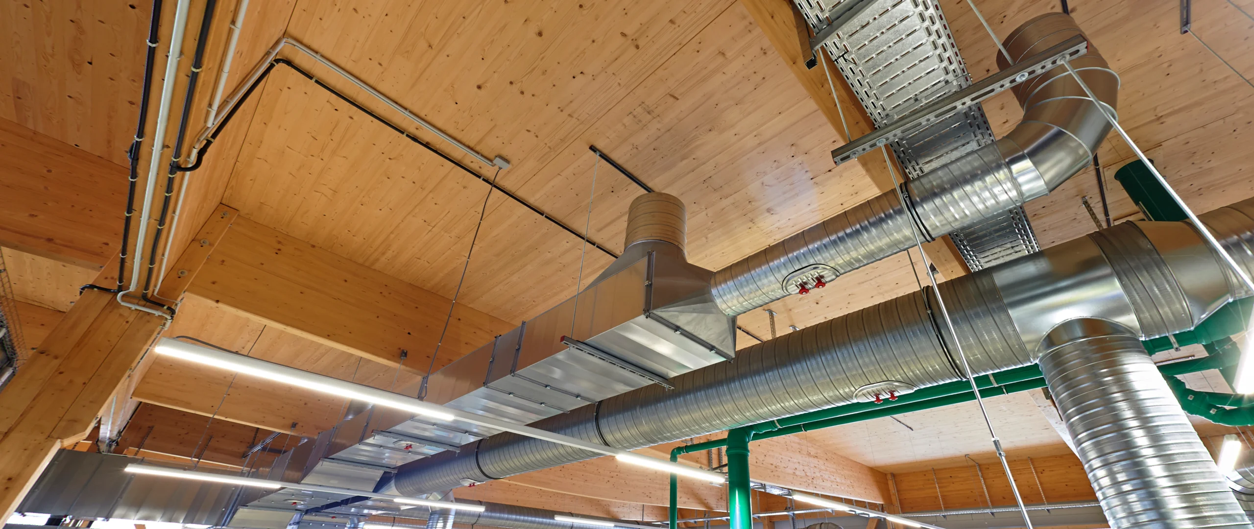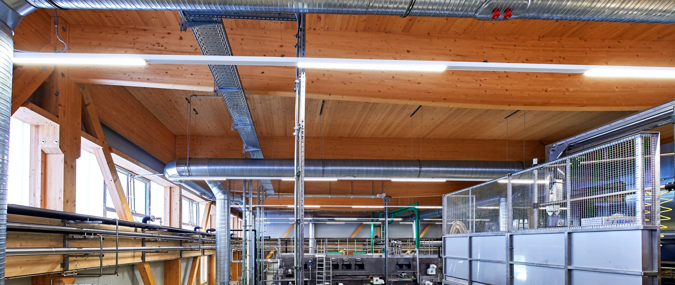 Von der Schaffitzel Holzindustrie wurden für die (B) 28,8m x (L) 36,65m x (H) 9,25m große Aufstockung 14 Fischbauchträger, 9 Abfangträger sowie diverse Stützen und Streben geliefert.