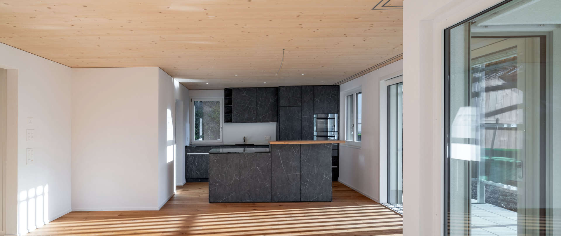Für die übrigen Wände sowie für die Decken kamen großformatige CLT-Elemente zum Einsatz, die nicht nur statisch tragend wirken, sondern auch die gestalterische Qualität heben. Sichtbare CLT- Decken mit hochwertigen und warmen Fichteoberflächen prägen die Innenarchitektur des Gebäudes. Das gesamte CLT-Material wurde als hbwCLT durch das HolzBauWerk Schwarzwald geliefert. Dabei setzen wir konsequent auf regionales Holz aus dem Schwarzwald – für kurze Transportwege, nachhaltige Wertschöpfung und eine authentische Materialherkunft.